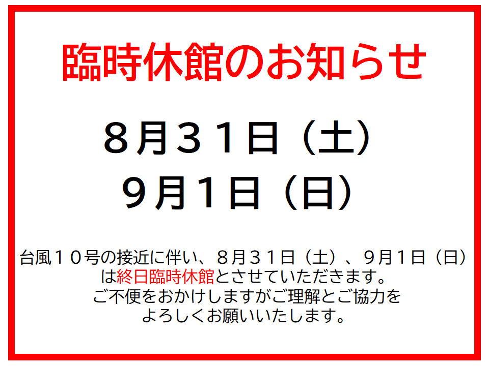 臨時休館のお知らせ(令和6年8月31日、令和6年9月1日)